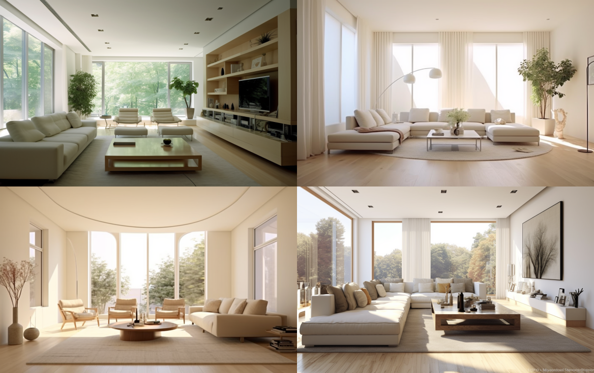 Interior Design, a perspective of a study, modernist, large windows with natural light, Light colors, plants, modern furniture, modern interior desig --ar 16:10 --v 5.1